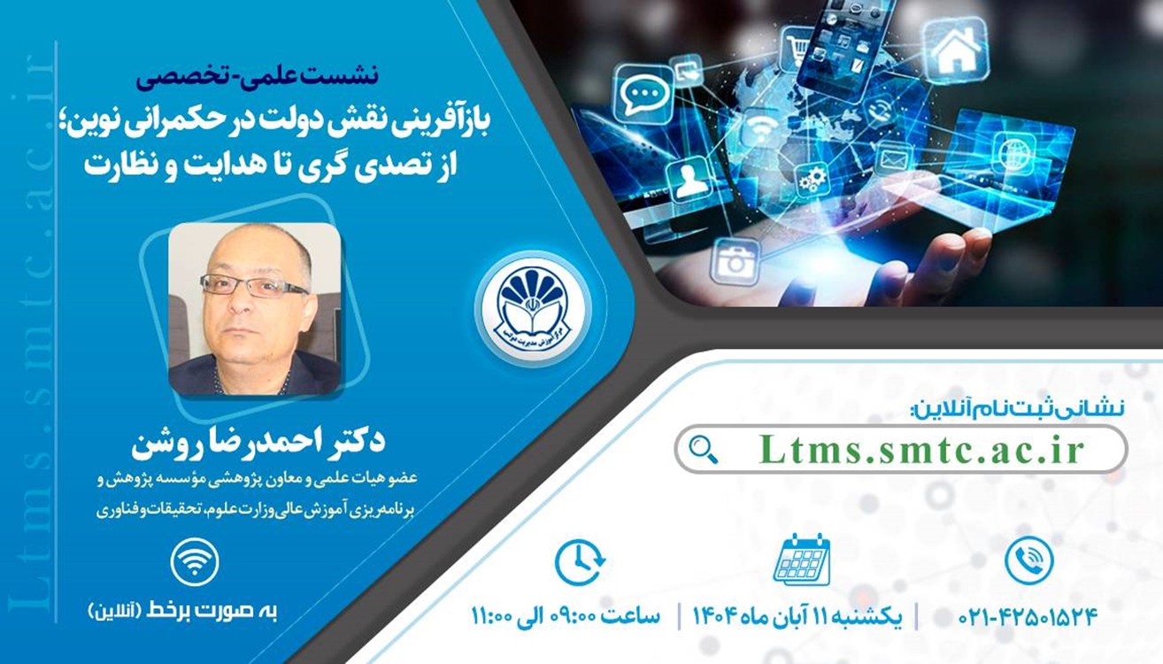 معاونت پژوهشی مرکز آموزش مدیریت دولتی در راستای تبیین الگویهای نوین حکمرانی و معماری ساختار کلان دولت و با هدف توانمندسازی و کارآمدی دولت و افزایش نقش هدایت و نظارت حکومت و همچنین پشتیبانی اندیشهای از برنامه اصلاح نظام اداری، به منظور افزایش بینش و دانش مدیران، کارشناسان و کارکنان دستگاههای اجرایی، نشست علمی- تخصصی با موضوع" بازآفرینی نقش دولت در حکمرانی نوین؛ از تصدیگری تا هدایت و نظارت " را با سخنرانی دکتر احمدرضا روشن، پژوهشگر حوزه سیاستگذاری و استاد دانشگاه، با حضور بیش از 500 نفر از علاقه مندان و فراگیران از مراکز علمی، دانشگاهی و دستگاههای اجرایی به صورت برخط، از طریق سامانه آموزشهای الکترونیکی(LTMS ) برگزار نمود.