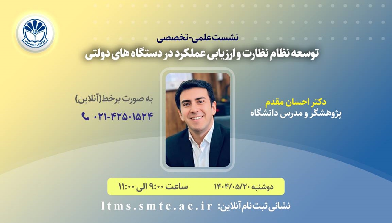 معاونت پژوهشی مرکز آموزش مدیریت دولتی در راستای ماوریت های سازمانی و پشتیبانی اندیشهای از برنامه اصلاح نظام اداری دولت چهاردهم، نشست علمی تخصصی با موضوع «توسعه نظام نظارت و ارزیابی عملکرد در دستگاههای دولتی » را با سخنرانی دکتر احسان مقدم، در روز دوشنبه 20 مرداد ۱۴۰۴با حضور بیش از 500 نفر از علاقه مندان و فراگیران از مراکز علمی، دانشگاهی و دستگاههای اجرایی به صورت برخط(آنلاین)، از طریق سامانه آموزشهای الکترونیکی(LTMS ) برگزار نمود.